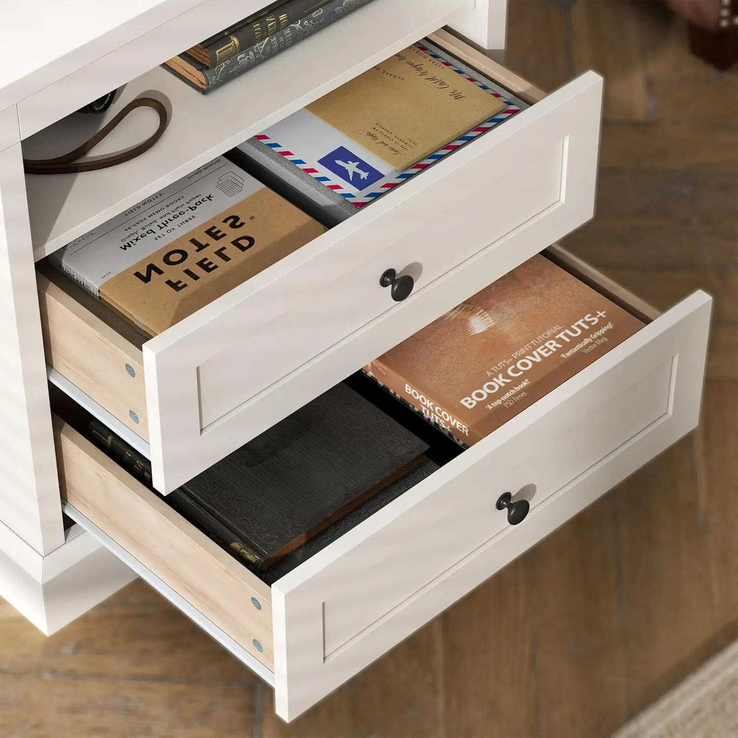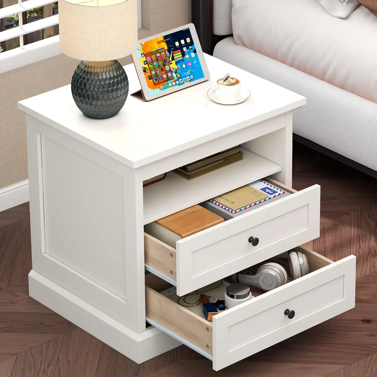 “bedroom storage side table with drawers and open shelf”