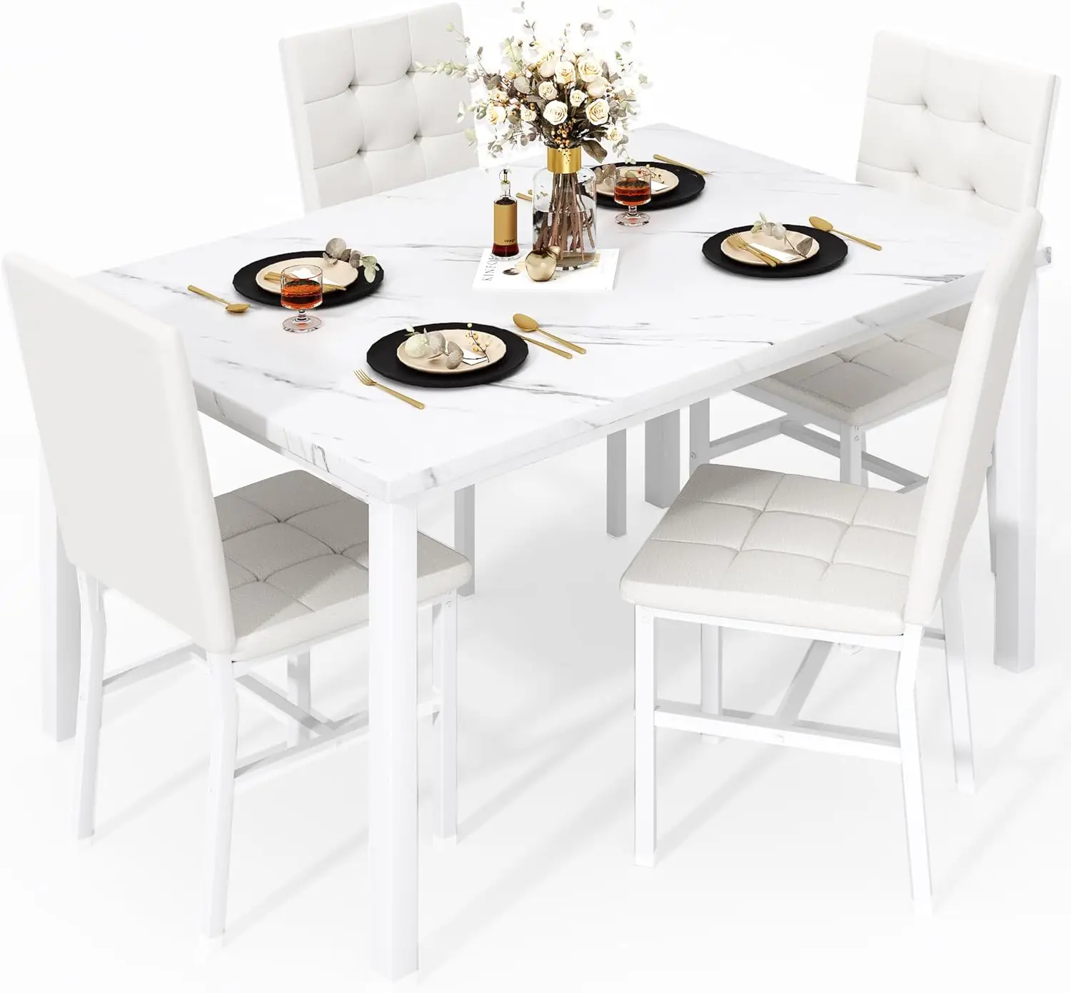 Dining Table Set for 4, Faux Marble Kitchen Table with 4 Leather Chairs, Modern White Dinette Set for Small Spaces