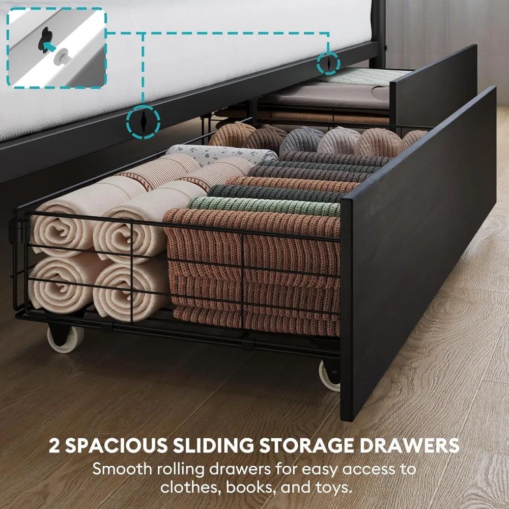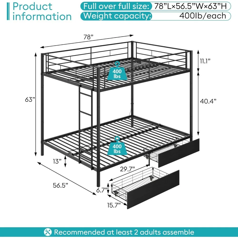This metal twin over twin bunk bed is crafted from reinforced steel, offering a sturdy and reliable sleeping solution that can support up to 270 lbs on the top bunk and 403 lbs on the bottom. It’s designed to provide a stable and safe sleeping environment for children, teenagers, or guests. The bunk bed comes with built-in LED lights that offer over 60,000 color options, allowing users to set the perfect mood lighting for their room. The lights can be controlled via an app or remote and even sync with music. For convenience, the bed features 2 USB ports and 4 Type-C ports integrated into the frame, making it easy to charge devices without the need for additional outlets. Additionally, the bunk bed includes 5 spacious drawers under the lower bunk for practical storage solutions. Safety features include full-length safety rails, non-slip ladder bars, and anti-fall protection strips, ensuring a secure and reassuring experience for both children and parents.