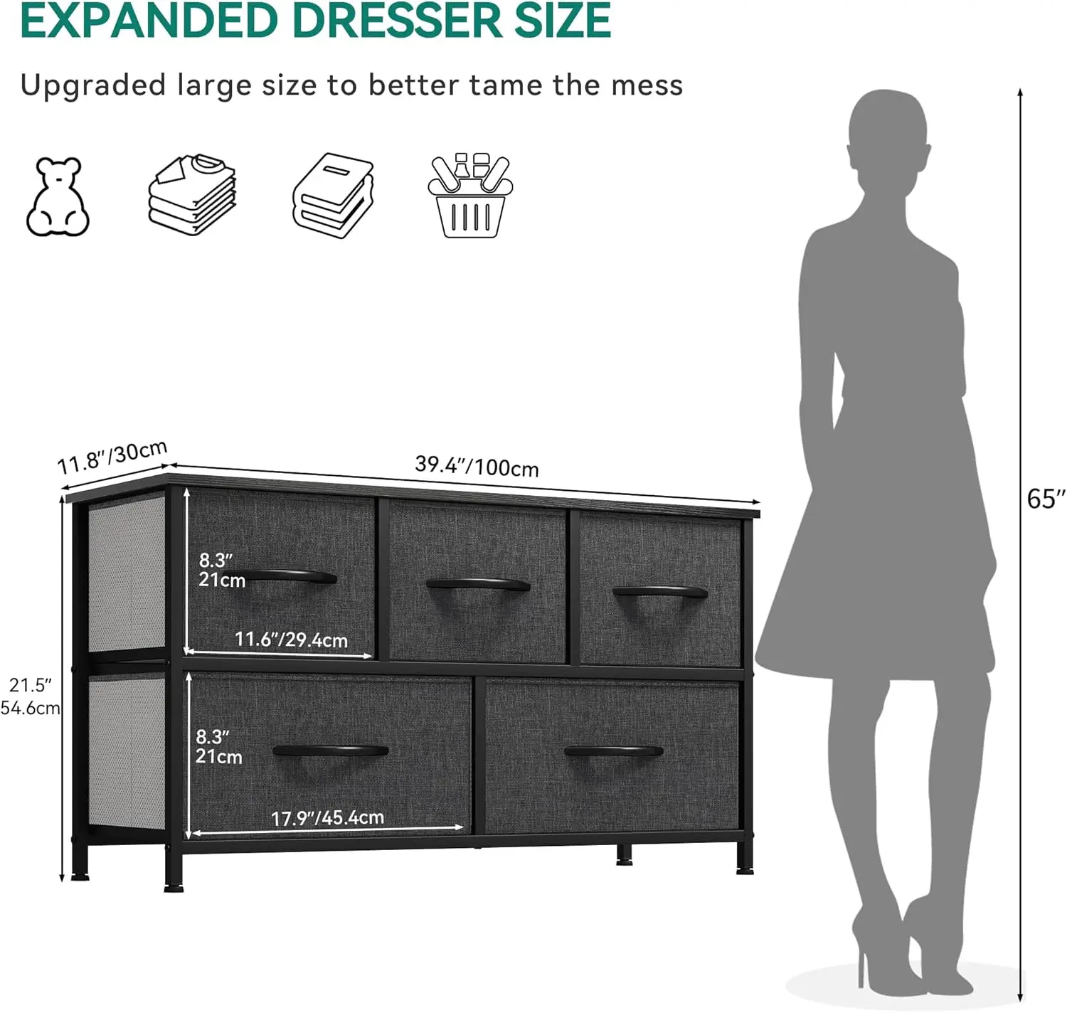 LARGE CAPACITY- 5 drawers in different sizes provide multiple storage options and ample room to make your living space neat and tidy; Overall dimensions: 39.4″ L x 11.8″ W x 21.5″ H, Drawer Dimensions: 17.9″ L x 11.2″ W x 8.3″ H / 11.6″ L x 11.2″ W x 8.3″ H.