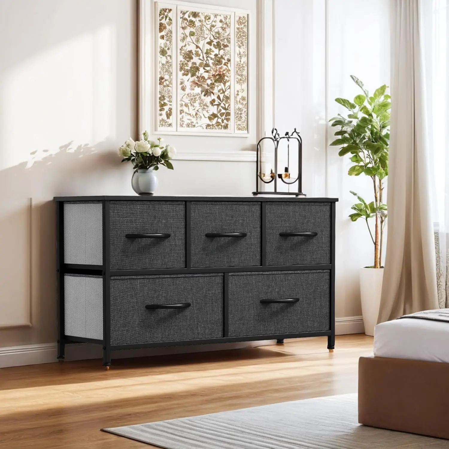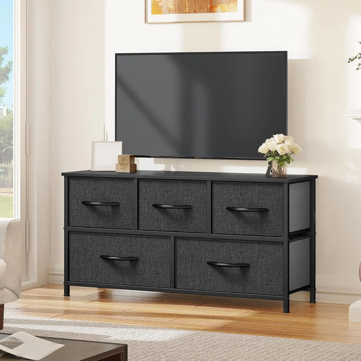 UNIVERSALLY COMPLEMENTARY- Premium black grey fabric drawers, with sturdy black metal frame and wooden tabletop; Enjoy modern scent and stylish aesthetics that easily complements various living spaces: living rooms, bedrooms, hallways, entryways, closets etc.