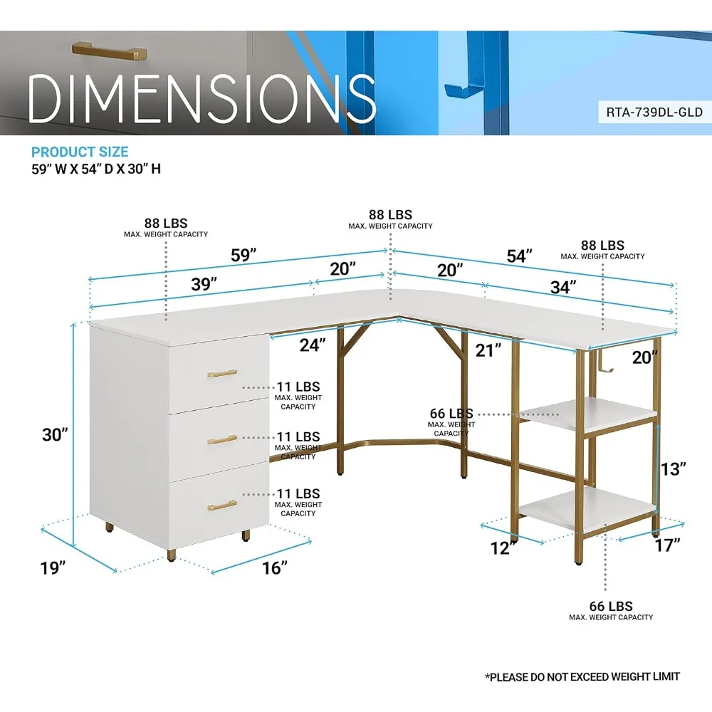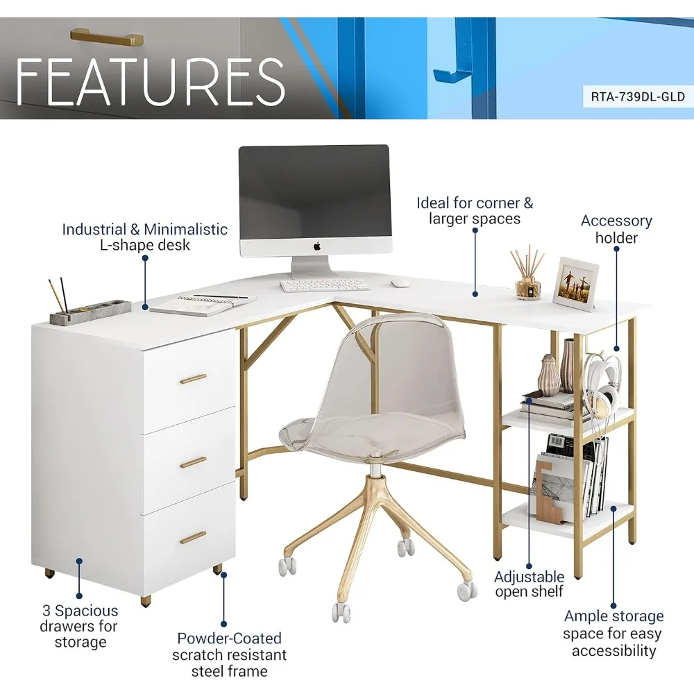 This L-shape desk is an ideal solution to optimize your workspace. It features an industrial wood grain finish with steel accents, offering a stylish and practical design. The desk includes three white pullout storage drawers, perfect for keeping your office supplies organized and easily accessible. An adjustable open shelf on the side provides additional storage and convenience. The desk is built with a powder-coated steel frame, ensuring both durability and stability. Additionally, it comes with an integrated accessory holder, and it can support a weight limit of up to 88 lbs.