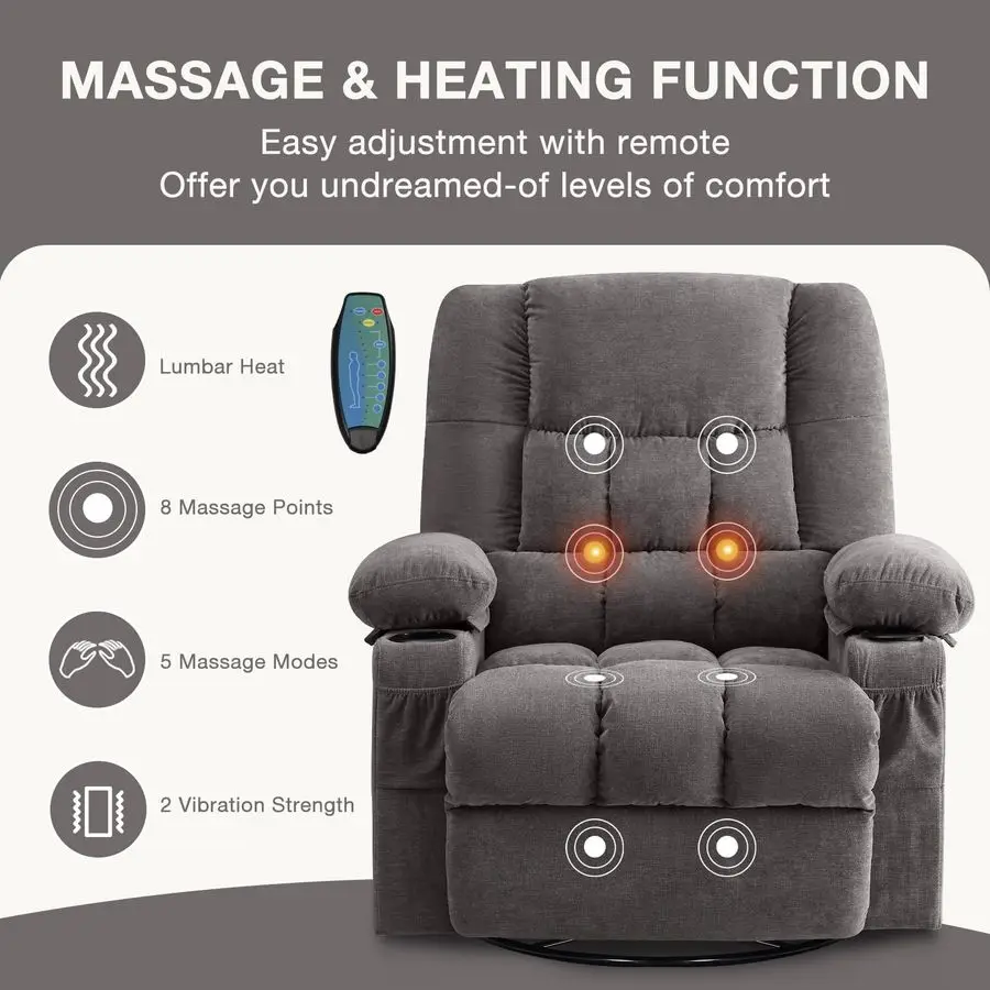amp This swivel rocker recliner with massage features 8 vibration massage points and 2 intensity options, catering to your unique needs. Targeting calves, thighs, waist, and shoulders, it allows for customized control of massage locations and intensities. Additionally, the waist area includes a heating feature to enhance blood circulation during your massage sessions.
