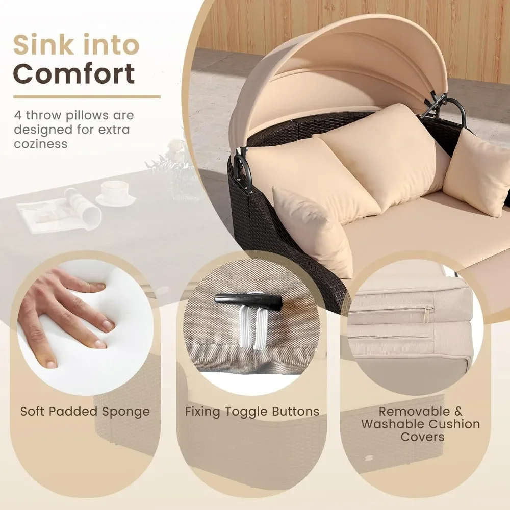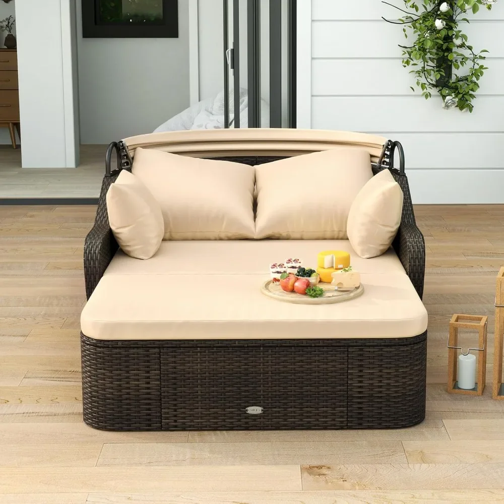 - [Personalized Shade Experience]: Enjoy personalized comfort with the convenient retractable canopy of this outdoor daybed, allowing you to adjust the shade to your desired level. The overall dimensions are 75.5” x 52” x 50” (L x W x H).