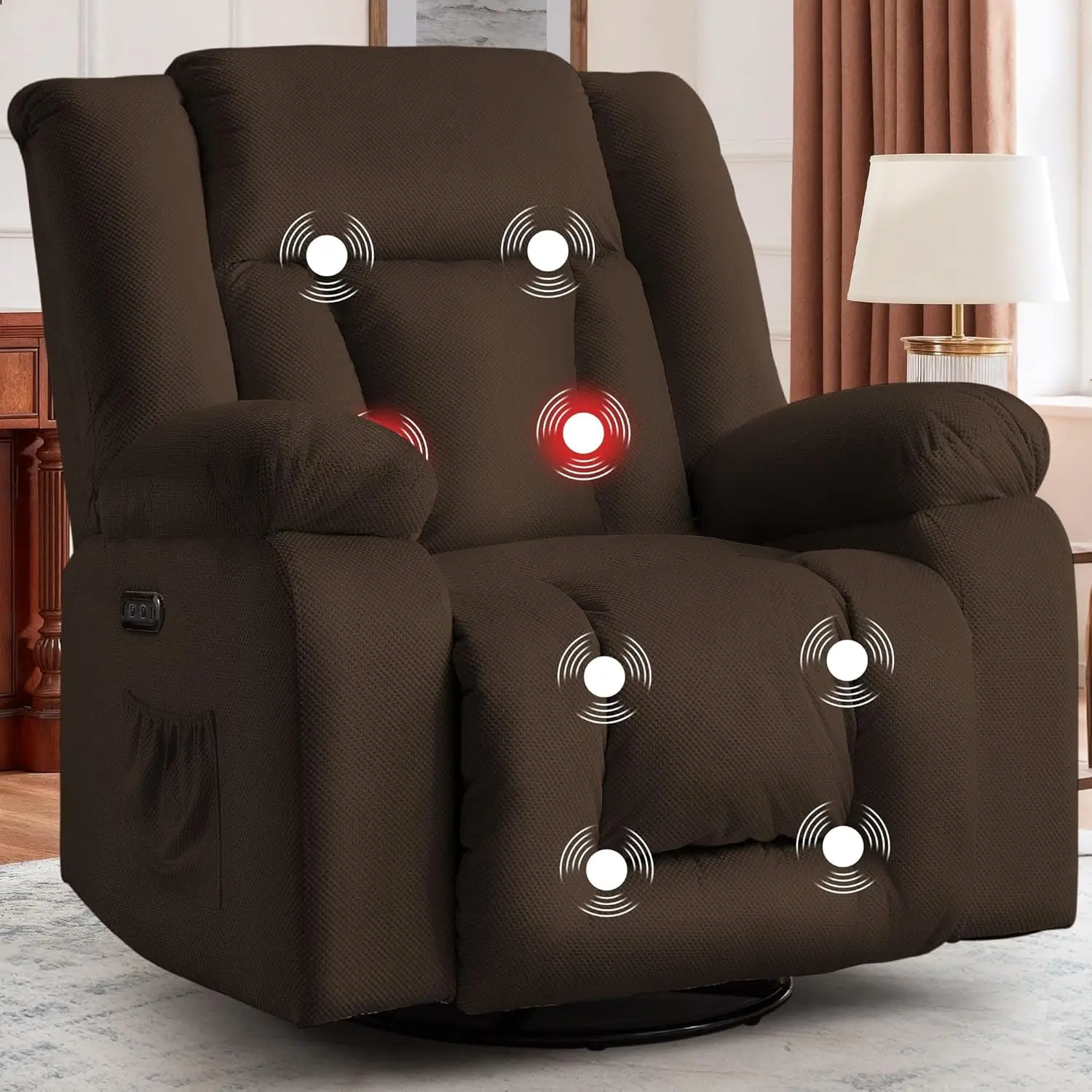 【Swivel and Rocking】oversized recliner has a 270-degree swivel and soothing rocking function, perfect for lulling children to sleep or relaxing after a long day at work. The swivel function adds fun to the massage sofa, and the slightly raised headrest can support your neck when you lie down. The gentle rocking motion of the electric massage chair helps relieve stress, and a quiet run will not bring you noise, creating a space of comfort, and stress relief