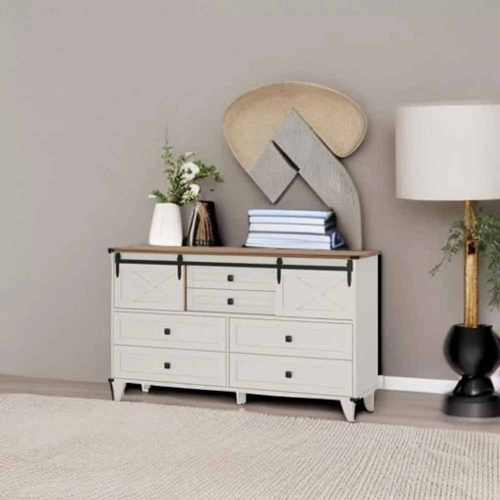 【Great Storage Solution】The long dresser features 4 large drawers and 2 small drawers, and the small drawers can be hidden behind the sliding barn door. The dresser has two small barn-door cabinets at either end, providing extra storage. to keep your room organized.