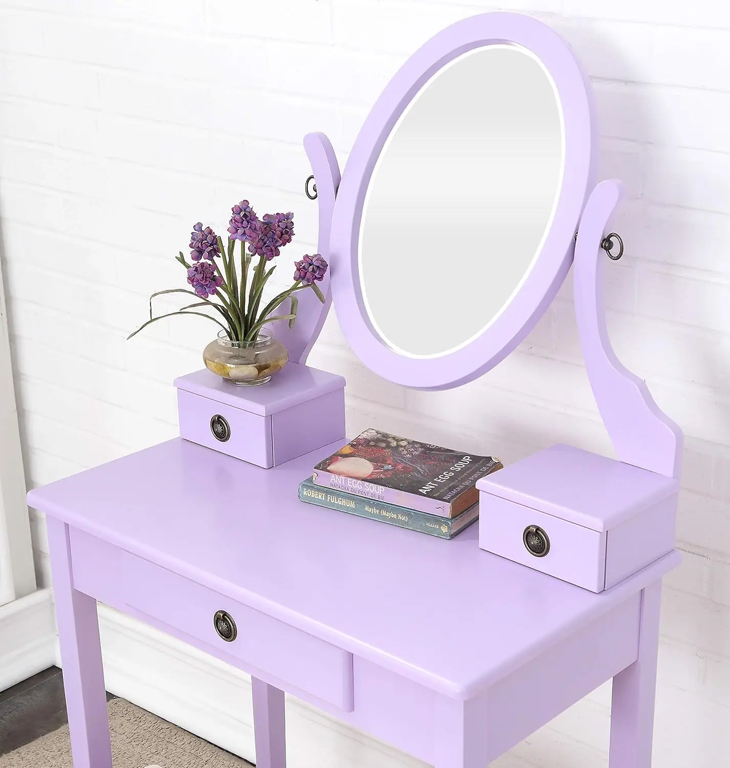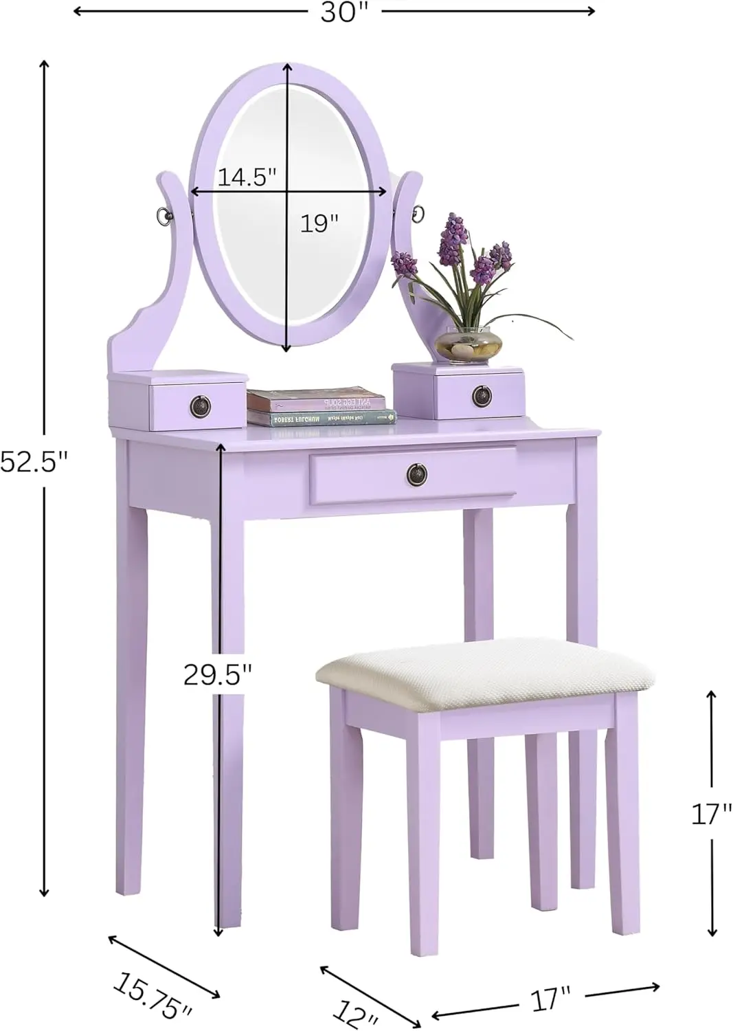 - Set includes Vanity table, mirror and stool, 3 storage drawers