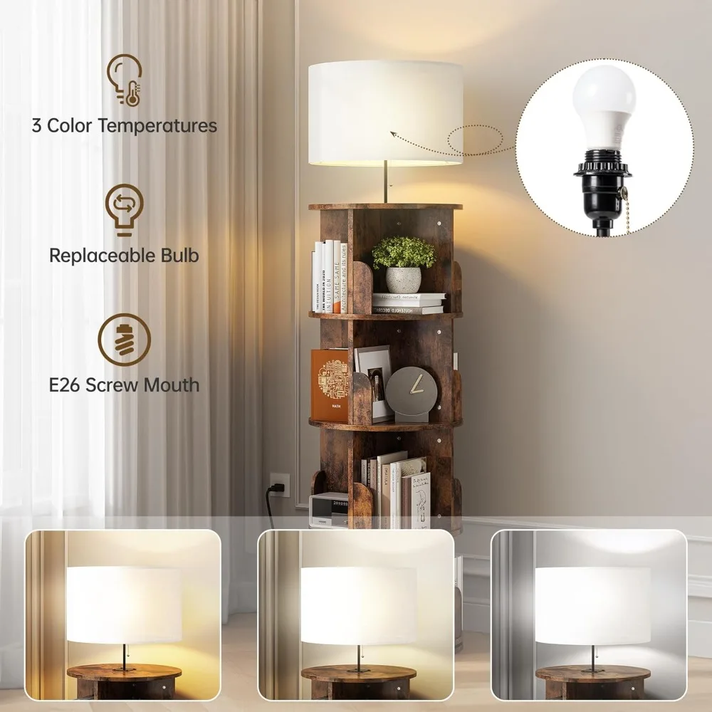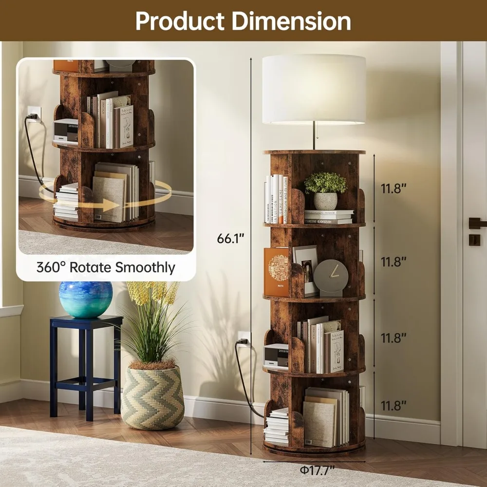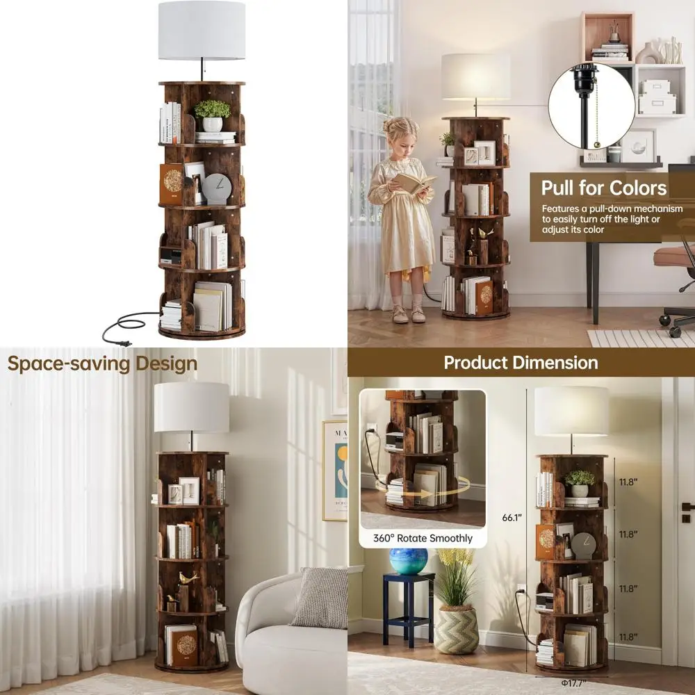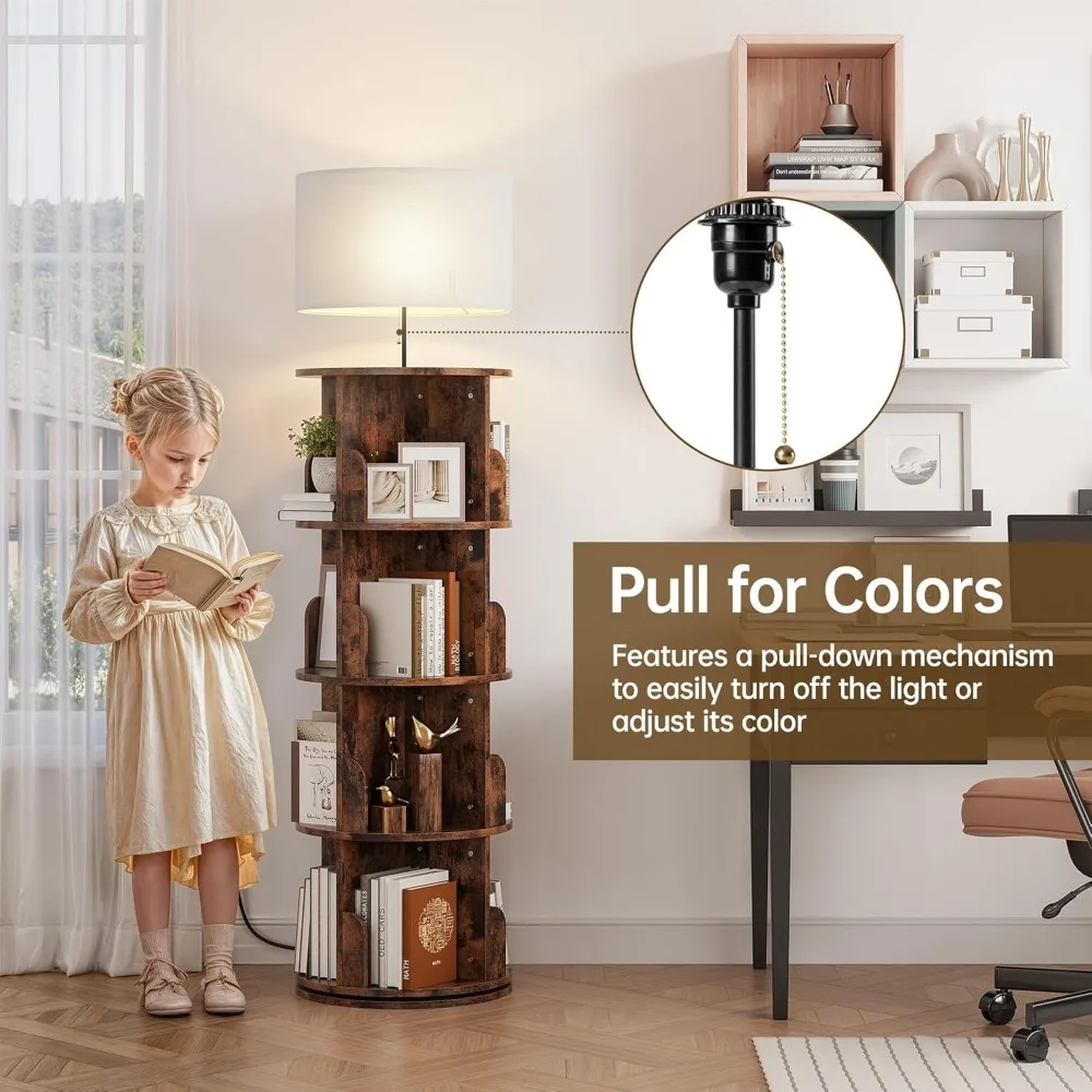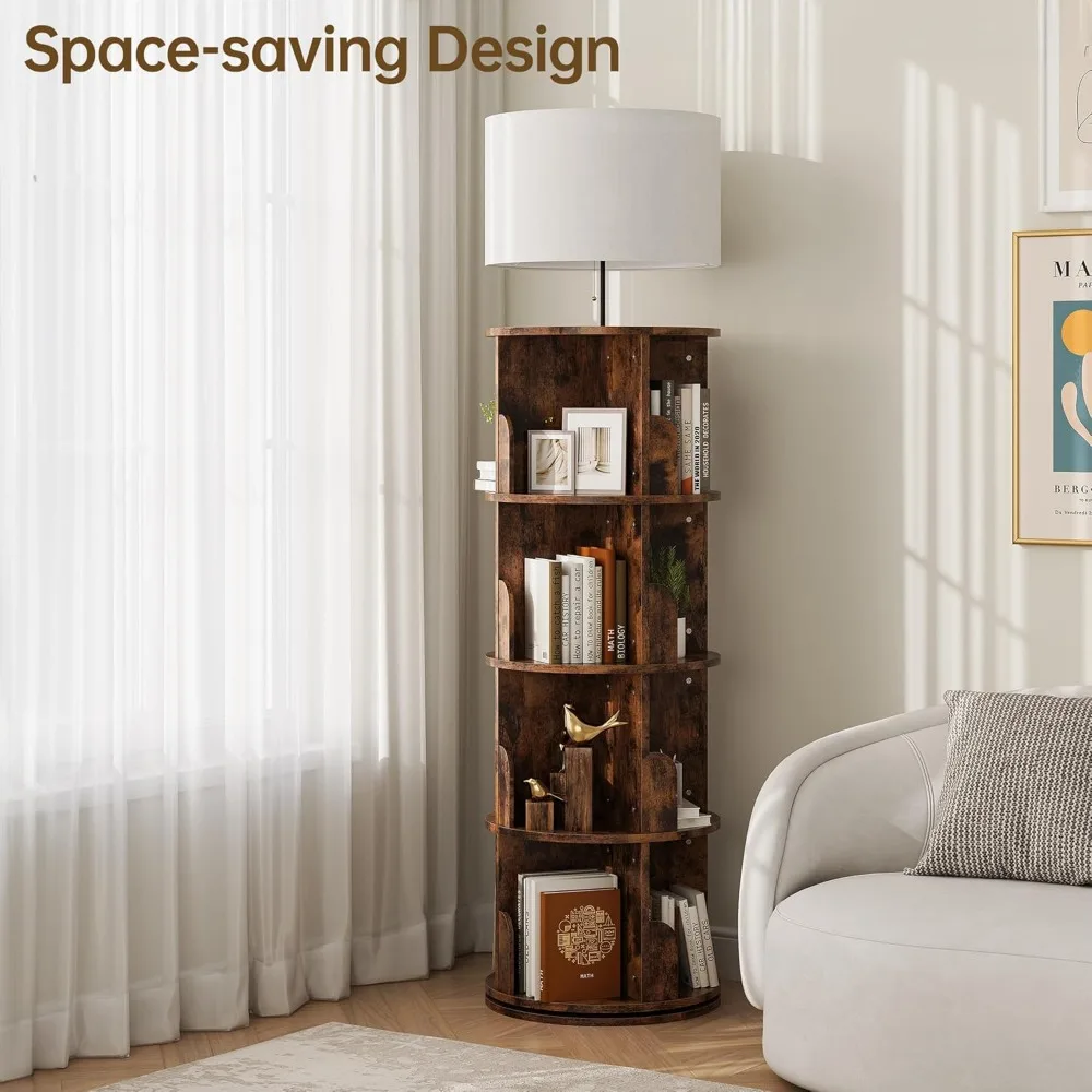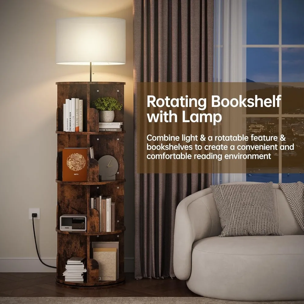 Vertical 4-Tier Revolving Bookshelf with Light, Floor Standing 360° Rotating Bookcase Organizer for Small Spaces